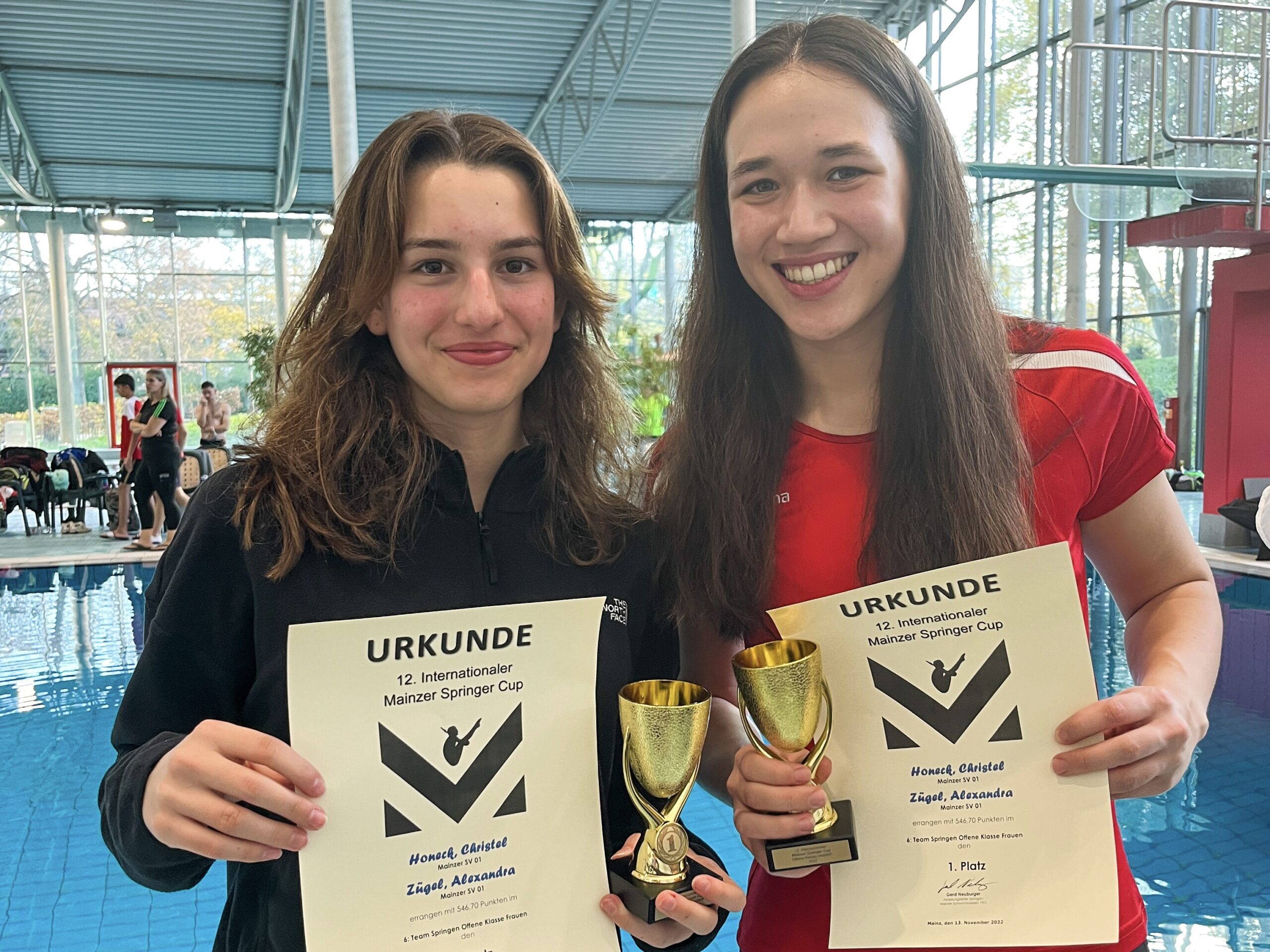 Alexandra Zügel ragte mit ihren 9 Titeln besonders heraus. Sowohl in der Jugend-A als auch in der Offenen Klasse der Damen erkämpfte sie sich von allen drei Höhen die Gold Medaille. Darüber hinaus gewinnt sie den länderübergreifenden Teamwettbewerb in der A-Jugend mit ihrem Partner Malte Schöneich. Auch Malte kann auf ein sehr erfolgreiches Wochenende zurückblicken. In seiner Altersklasse errang er vom 1 Meter und 3 Meter die Silber Medaille und vom Turm die Gold Medaille. Besonders erfolgreich war er allerdings in der Offenen Klasse der Herren und gewann hier den Rheinland-Pfalz Titel.