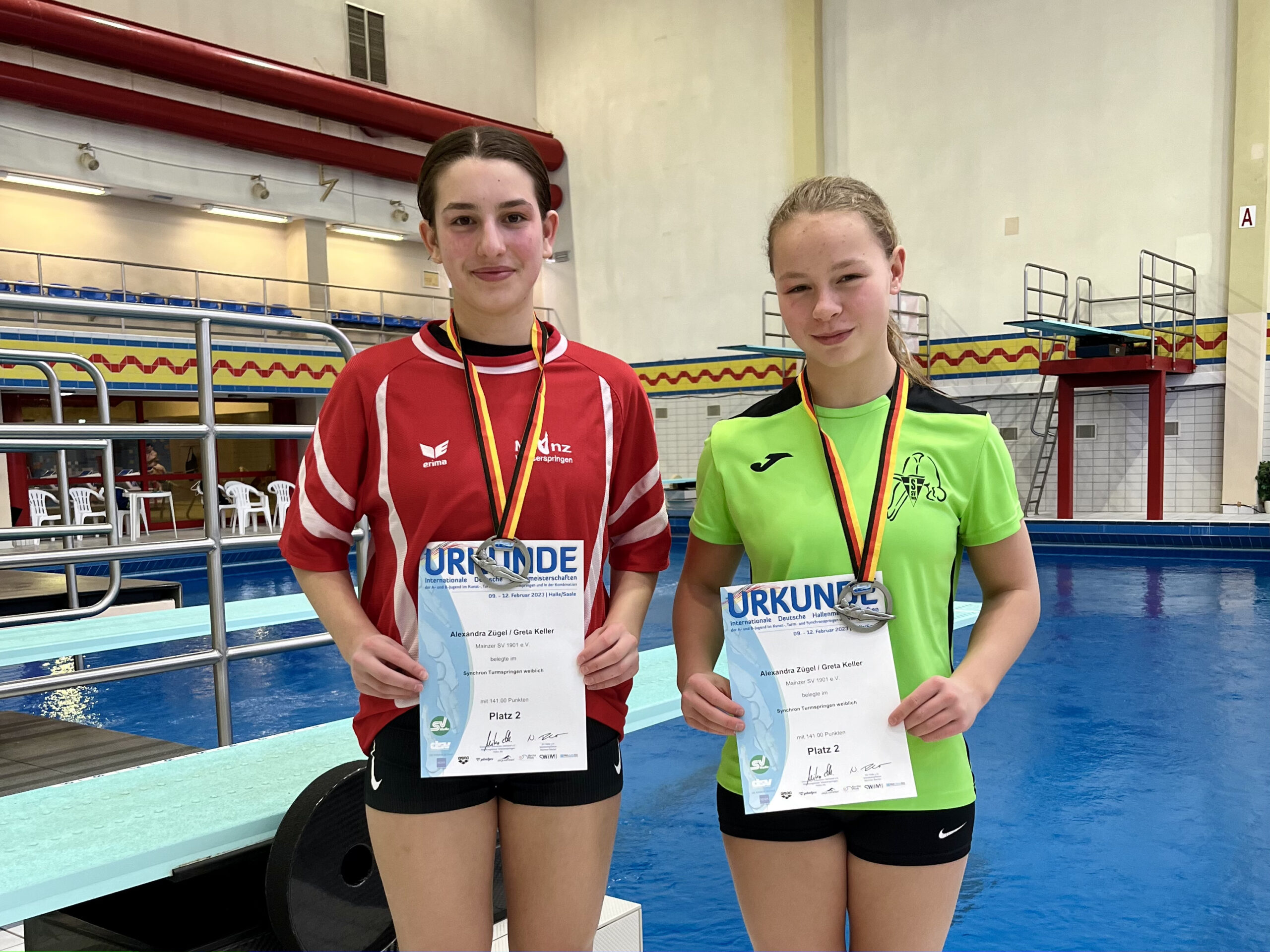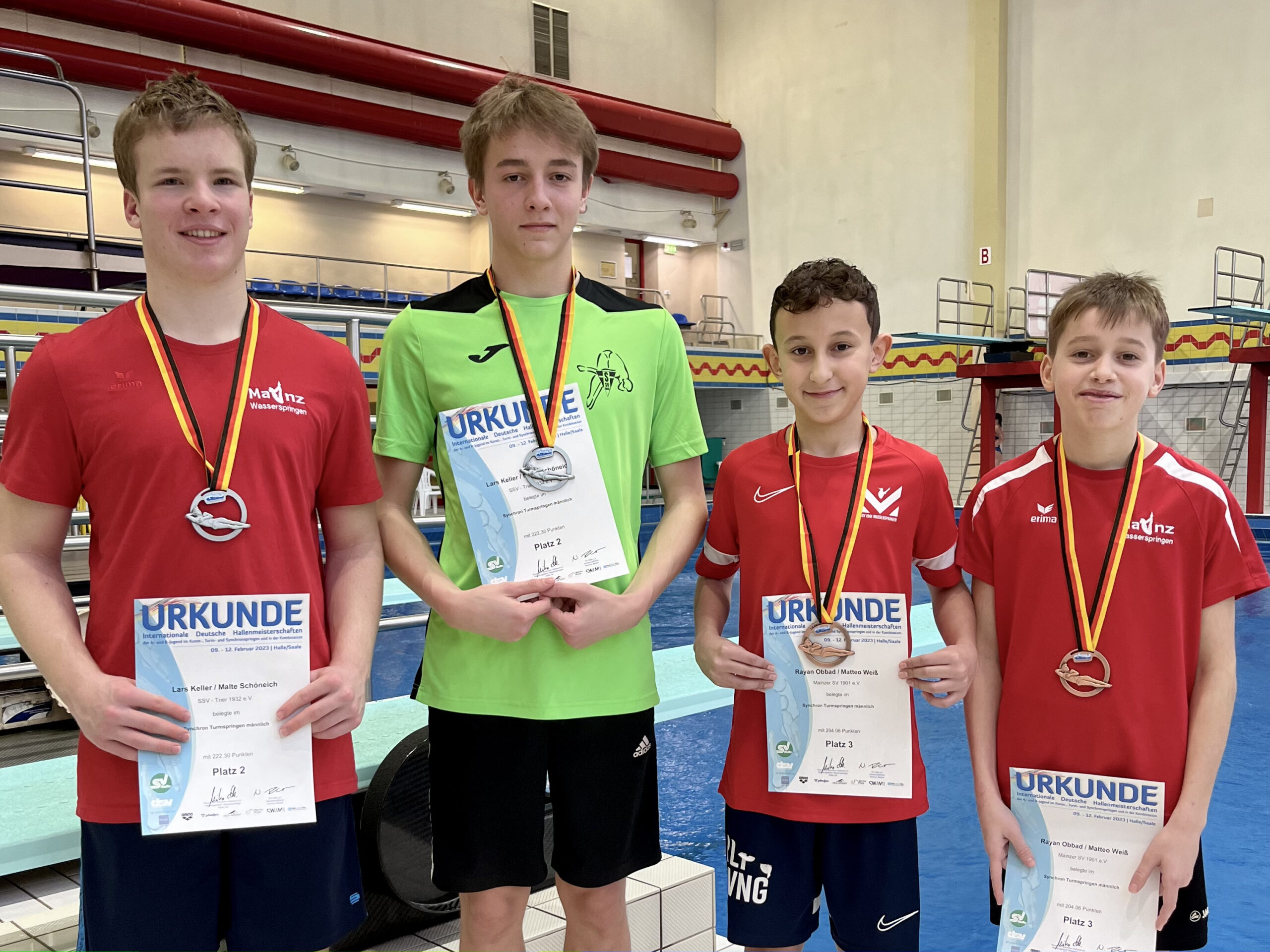 Mit drei Silber- und zwei Bronzemedaillen kehrte das Team Alexandra Zügel, Matteo Weiß, Rayan Obbad, Malte Schöneich, Mirja Wirth und Gerd Neuburger recht zufrieden aus Halle zurück. Am ersten Tag der Internationalen Deutschen Hallenmeisterschaften der A- und B-Jugend konnten Malte Schöneich und sein Partner Lars Keller (SSV Trier) sich die Silbermedaille beim Turm-Synchronspringen erkämpfen. Einen Platz dahinter konnten sich Matteo Weiß mit seinem Partner Rayan Obbad (2. Jahr C-Jugend) über die Bronzemedaille freuen. Nach dem gelungenen Auftakt ging es für Malte in seinen Einzeldisziplinen nicht so reibungslos weiter. Sowohl beim 1 Meter Wettkampf (4. Platz) als auch beim 3 Meter Wettkampf (4. Platz) zeigte er hier und da Schwächen und konnte sein Können nicht vollkommen unter Beweis stellen. Am letzten Tag der Jahrgangsmeisterschaften hat er allerdings beim Turm Wettkampf eine schöne Leistung gezeigt und gewann hierfür die Bronzemedaille. Insgesamt konnte Malte sich in der Kombinationswertung über eine Silbermedaille freuen. Für Matteo war es dieses Jahr der erste Wettkampf in der B-Jugend. Er konnte in allen drei Einzeldisziplinen souverän durchspringen und erzielte vom 1 Meter und 3 Meter den 9. Platz und vom Turm den 7. Platz. In der Kombinationswertung belegte er ebenfalls den 7. Platz. Zusammen mit Rayan belegte er beim 3 Meter Synchronspringen hinter Malte und Lars den 5. Platz. Für Alexandra waren es dieses Jahr ebenfalls die ersten Jahrgangsmeisterschaften in ihrer Altersklasse. Sowohl vom 1 Meter und vom Turm zeigte sie eine sehr schöne Leistung und erzielte dabei den 6. und 4. Platz. Zusammen mit ihrer Partnerin Greta Keller (SSV Trier) gewannen sie beim Turm Synchron die Silbermedaille. Beim 3 Meter Synchronspringen belegten sie den 5. Platz.
