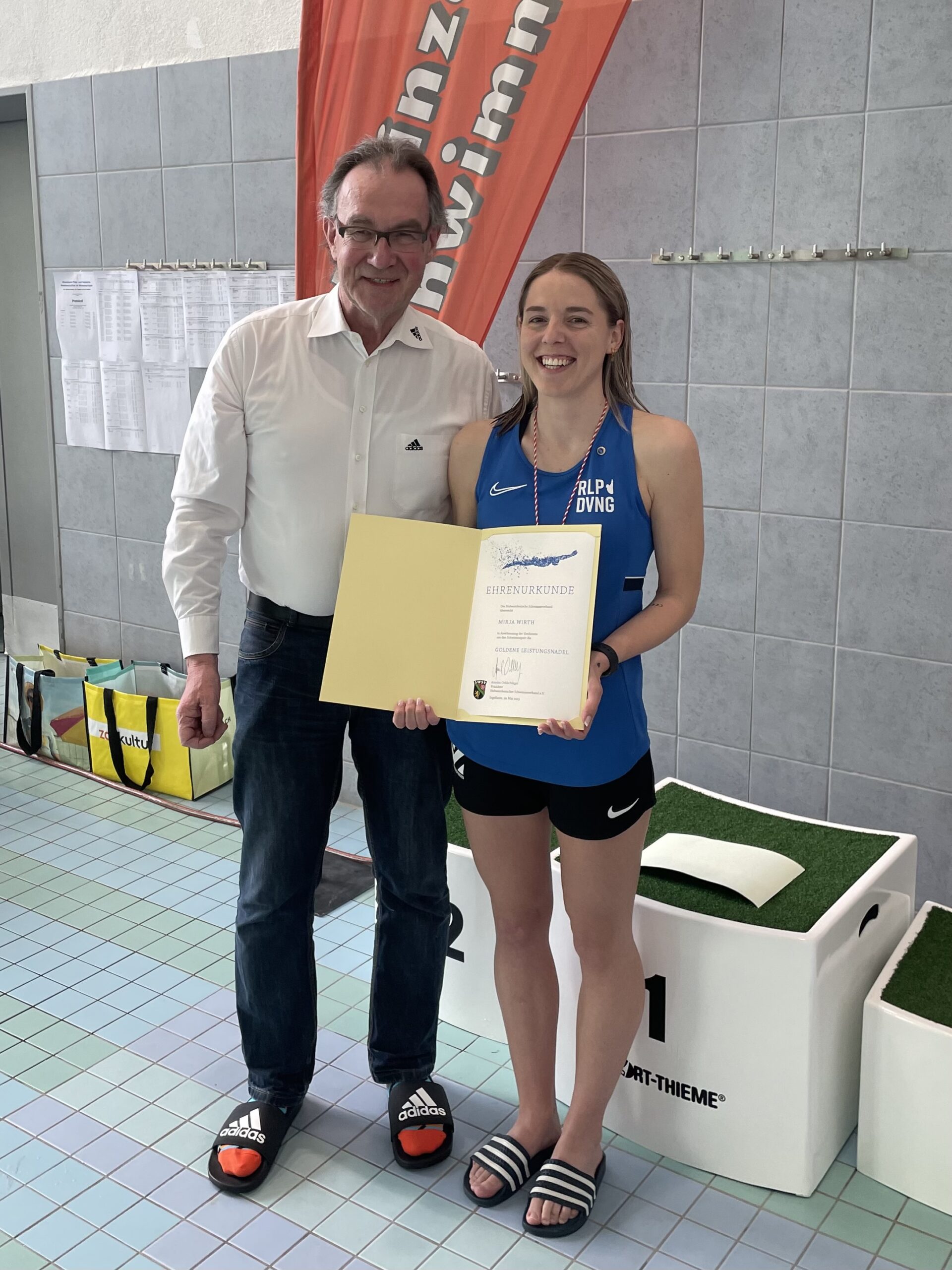 Im Zuge der Veranstaltung wurde die Landestrainerin Mirja Wirth in Anerkennung ihrer langjährigen herausragenden Leistungen auf Landes- bis DSV-Ebene und ihrem Engagement im Wasserspringen als Kampfrichterin und Trainerin vom Präsidenten des Südwestdeutschen Schwimmverbandes Anselm Oelschlägel mit der Goldenen Leistungsnadel des SWSV ausgezeichnet. Herzlichen Glückwunsch!