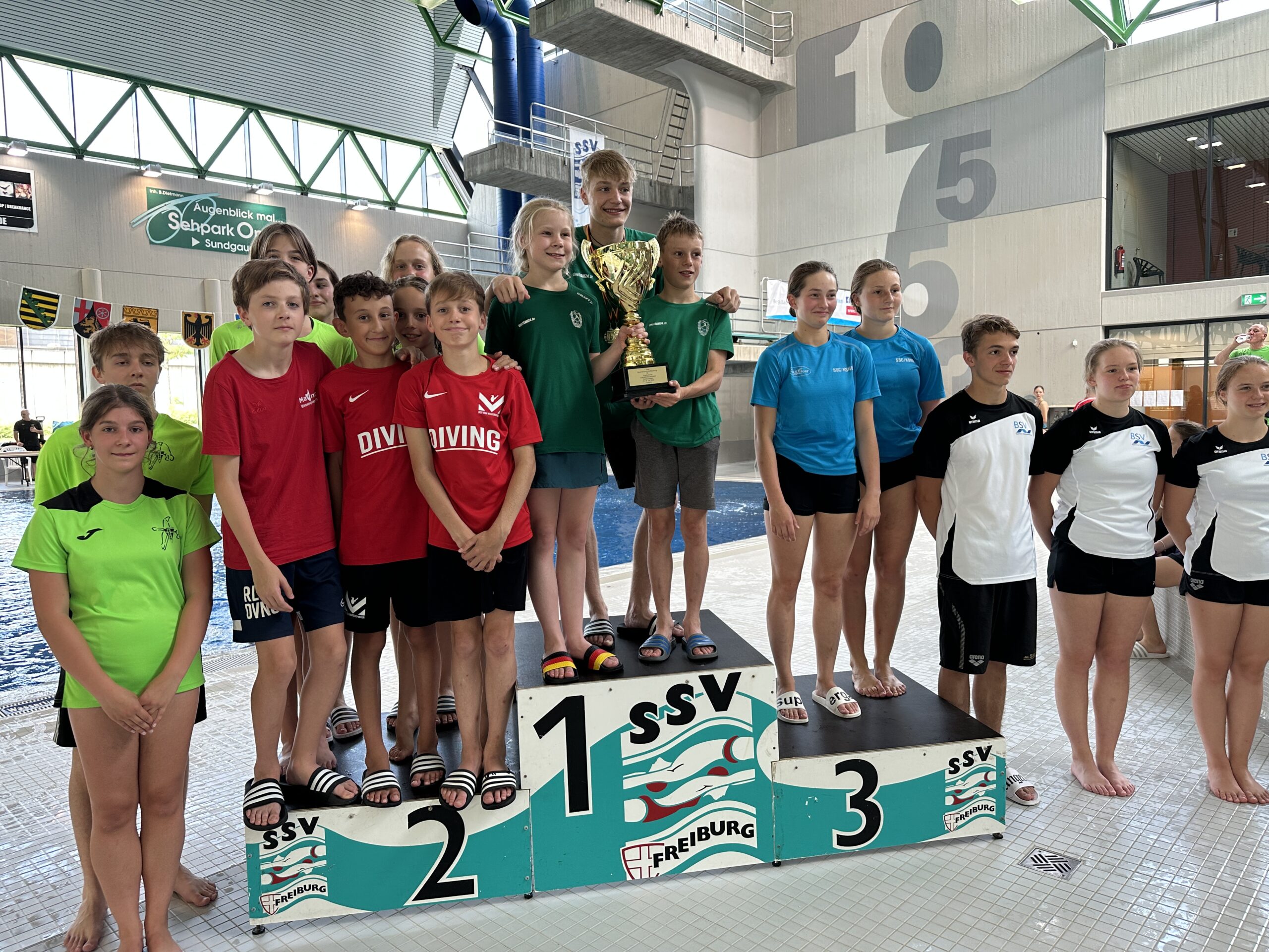Rolf Stahl (Präsident SVR), Bianca Schmitt (Fachwartin Wasserspringen SVR), Greta Keller (SSV Trier), Malte Schöneich (MSV), Lena-Emily Schmitt (SSV Trier), Lars Keller (SSV Trier), Jakob Batzer (MSV), Alexandra Zügel (MSV), David Curda (MSV), Jakob Zinecker (MSV), Rayan Obbad (MSV), Matteo Weiß (MSV), Mirja Wirth (Landestrainerin RLP), Dorothée Neuburger (Landesleistungssportbeauftragte RLP, Fachwartin Wasserspringen SWSV).