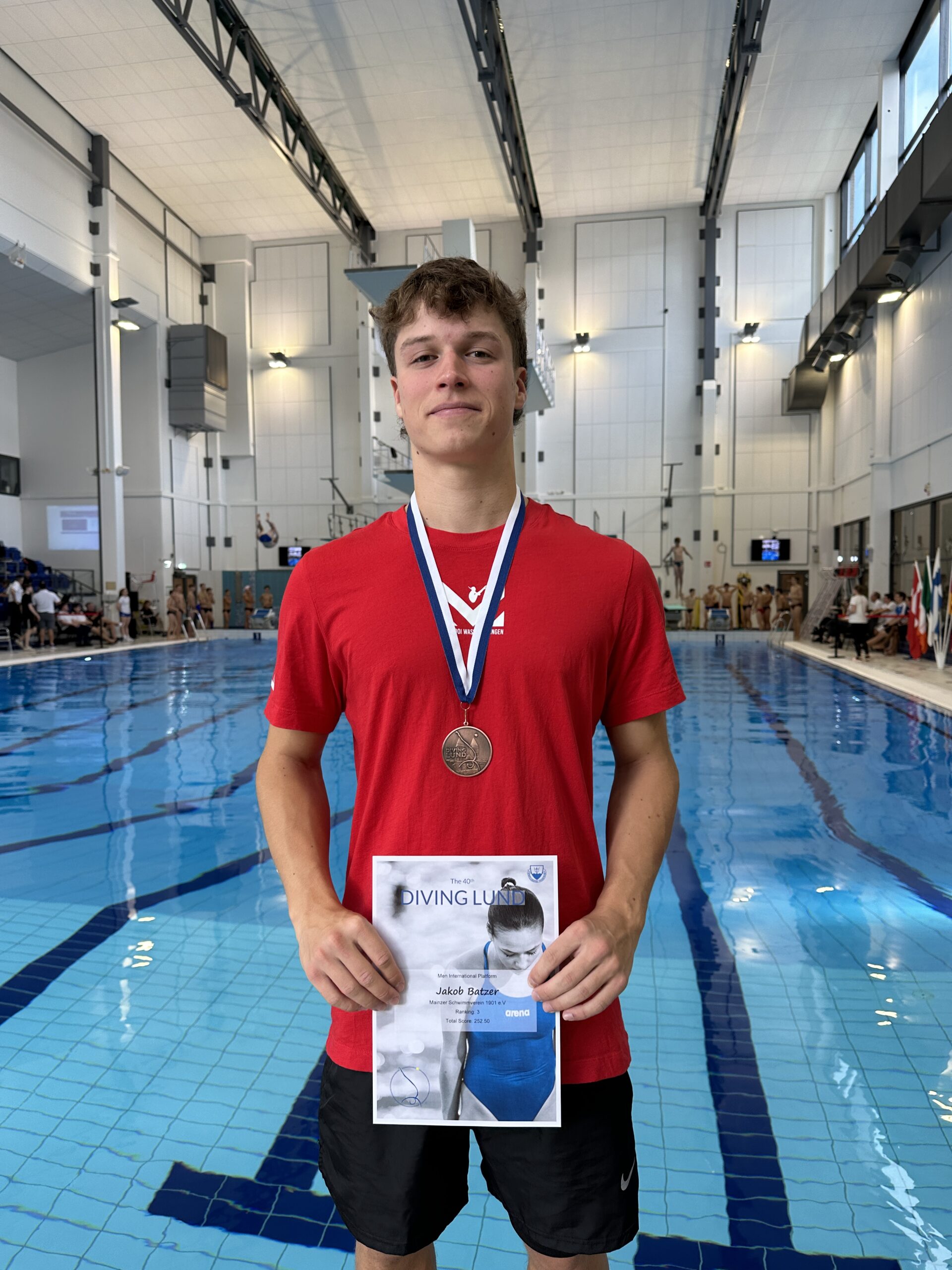 Er startete beim DSV-Kürpokal von allen drei Höhen. Bei seinem 1 Meter Wettkampf konnte Jakob sich vom Vorkampf (12.) bis ins Finale durchkämpfen und belegte den 10. Platz. Auf dem 3m-Brett hat es leider nicht für das Halbfinale gereicht und er musste sich nach dem Vorkampf mit Platz 35 zufriedengeben. Leider konnte er hier seine Wettkampfleistung nicht abrufen, was aber auch dem geschuldet ist, dass am Landesstützpunkt Mainz momentan seit Juli 2023 kein 3 Meter sowie 5 Meter Training mehr möglich ist – aktuell kann nur 1 Meter trainiert werden. Umso erstaunlicher ist Jakobs Leistung beim Turmwettkampf. Er schaffte hier ebenfalls den Einzug ins Finale. Mit einem 11. Platz im Vorkampf, einem 12. Platz im Halbfinale belegte er im Finale den 10. Platz.
